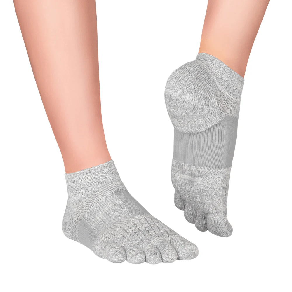 Șosetele funcționale cu degete care îți oferă susținere și energie: compresia accentuată în zona mediană a piciorului stabilizează piciorul și susține toate cele trei bolți plantare.
